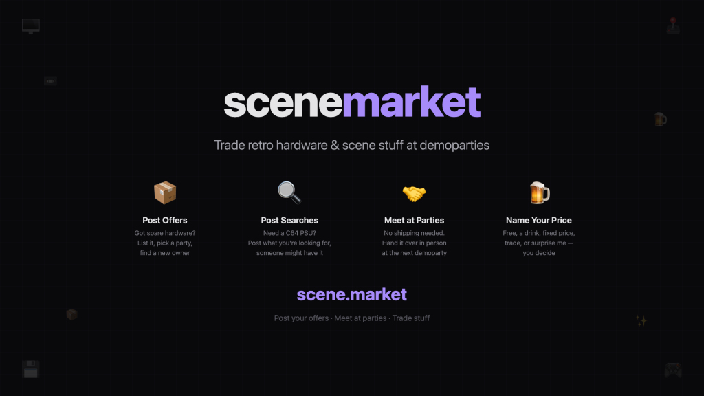 Phil hat den scene.market gelauncht – einen super simplen Marktplatz zum Kaufen / Verkaufen / Tauschen von Sachen auf Demoparties (kein Versand, nur persönliche Übergaben vor Ort).